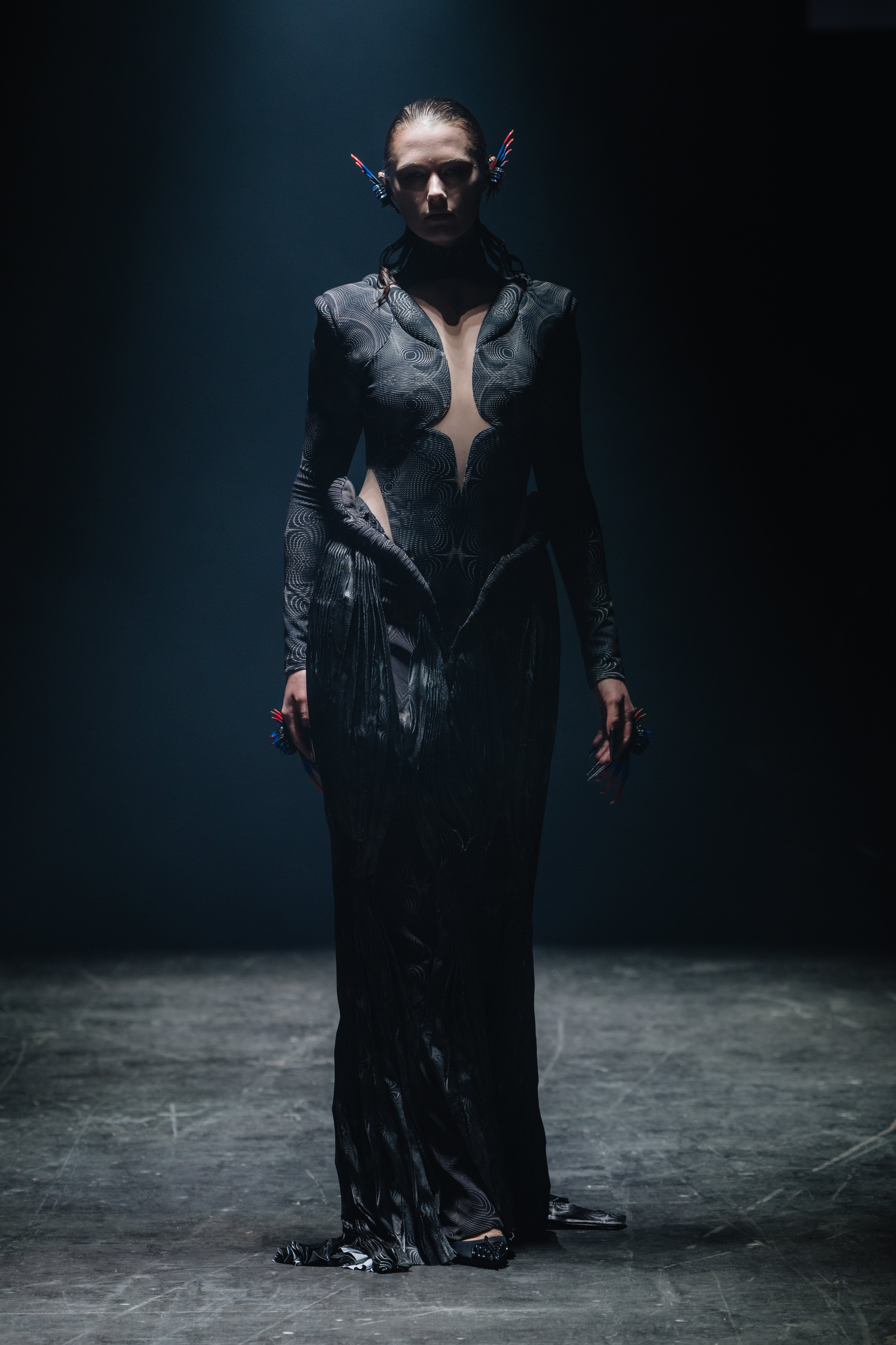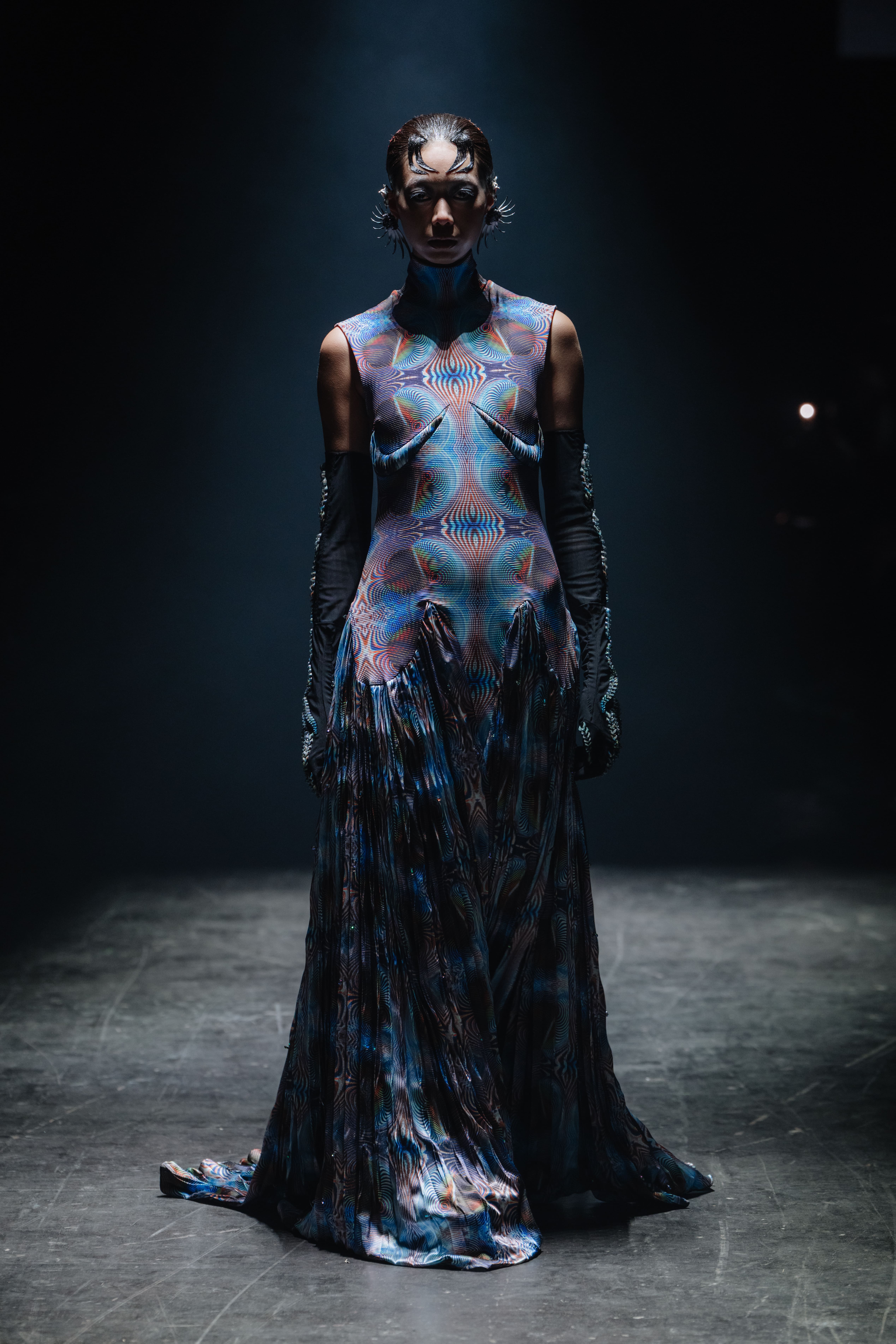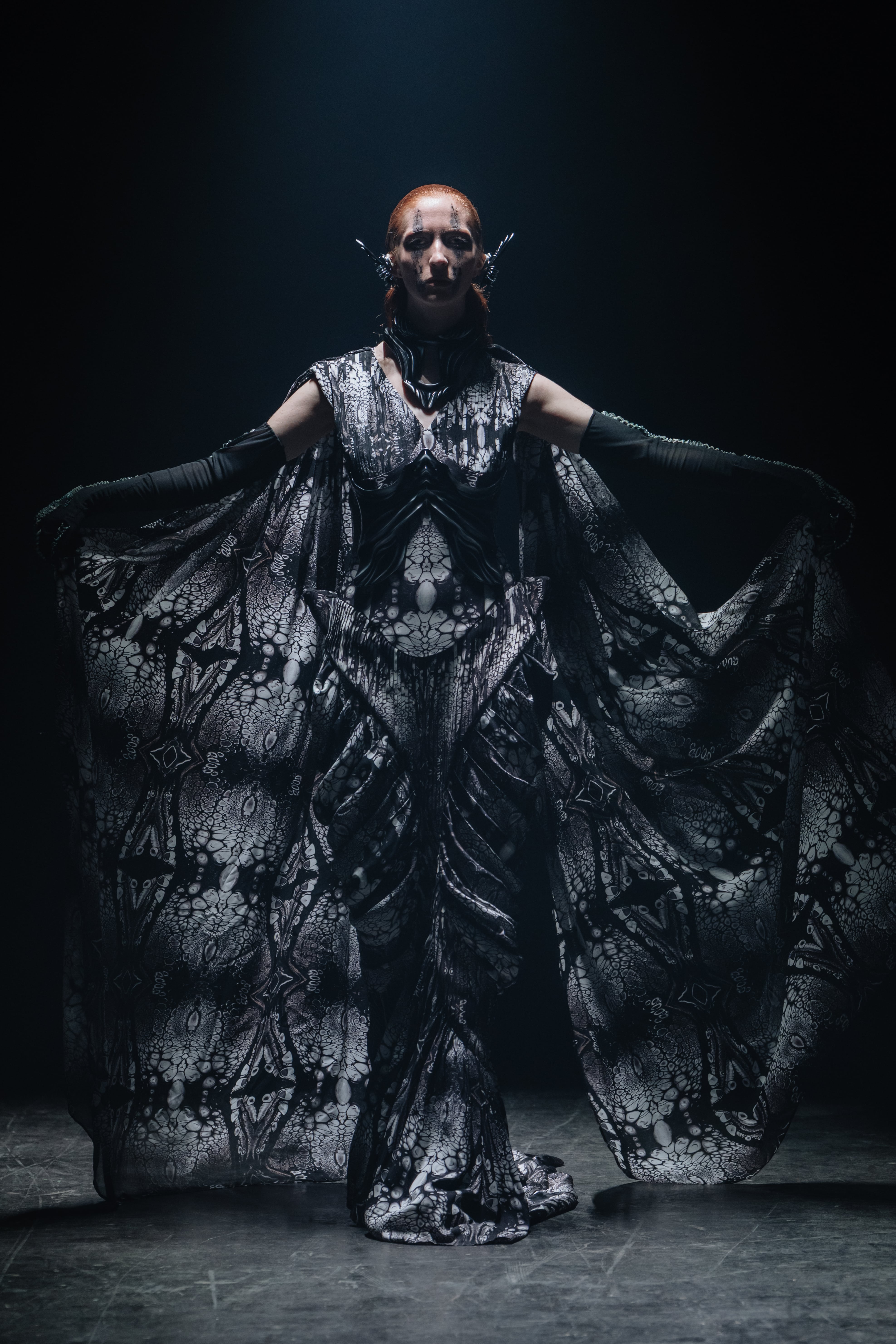 This thoughtful process is evident in Wang's designs. (1) One piece that stood out to me was a bronze armour reminiscent of a skeleton - the intricate green details gave it a futuristic touch, seamlessly blending history with modernity. ‘In Exogenesis, Chinese bronze sculpture and ancient armour were reimagined as futuristic exoskeletal forms’, Wang began to explain. ‘Skeletal and bionic structures were interwoven with Karl Blossfeldt’s botanical geometries and Ernst Haeckel's biological symmetries, while traditional embroidery and jacquard were juxtaposed with 3D-printed textiles and algorithmic patterns’. These techniques stand out in Wang's designs and demand your attention, the detailed bodice captures this fusion and unique approach to fashion. ‘These hybrid languages allow me to create a design system that bridges mythology, biology, and speculative technology’.